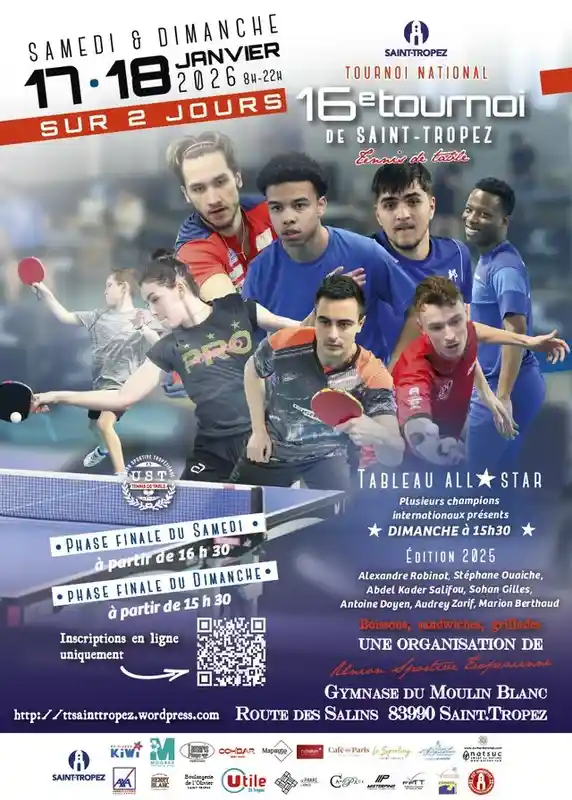 Le club de l’UST Tennis de table organise depuis 15 ans un tournoi national en plein mois de janvier... Cette année, ce sont les samedi 17 et dimanche 18 janvier 2026. L’offre évolue avec un niveau de jeu en hausse avec notamment l’intégration d’un tableau All Star constitué de joueurs de classe internationale... Et par effet de levier, les autres tableaux ont attiré des joueurs de meilleur niveau, notamment dans le tableau toute série... A cette heure, sont annoncés : Can Akkuzu (18e Français), Stéphane Ouaiche (36e F, tenant du titre 2025), Alexandre Robinot (23e F, finaliste 2025 et vainqueur 2024), Ylane Batix (94e Mondial), Sohan Gilles (85e F), Guillaume Alcayde (113e F), Antoine Doyen (122e F), etc... Cela va donc donner des matchs de très haut niveau, ce qui devrait attirer des spectateurs attendus nombreux... L’accès au complexe du Moulin Blanc reste gratuit pour tous ! Nous sommes limités au niveau place pour garder une qualité de jeu confortable pour les joueurs et les organisateurs. Environ 150 joueurs pourront s’inscrire ! Ce qui va représenter autour de 500 personnes avec les accompagnants... Les finales des tableaux excellence (Toute série Messieurs, tableau numérotés -300 Français) avec remises de prix se dérouleront à partir de 19 h 30 le samedi 17 janvier 2026 à la salle des sports du Moulin Blanc. Le tableau toute série démarre à partir de 11h... Dimanche, d’autres tableaux de tout niveau et pendant une heure, les joueurs pro feront une exhibition sous forme de All Stars Speed Ping ! Spectacle garanti ! à 15h30... Point infos : 16e tournoi national de tennis de table à Saint-Tropez, qui se déroulera le samedi 17 et dimanche 18 janvier 2026, nous pouvons annoncer d’ores et déjà la venue d’un grand joueur français : Can Akkuzu, actuellement 18e Français viendra pour la première fois à Saint-Tropez. Champion de France en 2019, médaillé de bronze aux Jeux Européens en 2023 au côté des frères Lebrun et Simon Gauzy, médaillé de bronze également aux championnats d’Europe en 2023 avec l’équipe de France. Il joue actuellement aux Loups d’Angers TT. Auquel, nous confirmons la venue à nouveau du champion en titre du 15e tournoi de Saint-Tropez : Stéphane Ouaiche, 36e Français (Double champion de France senior (2014 et 2016), double champion de France en double (2023 et 2016). Vice-Champion de France en double (2015, 2019), médaillé de Bronze par équipe aux Championnats d’Europe en 2015. Et également, du vainqueur 2024 et finaliste 2025, Alexandre Robinot, 23e Français (Champion de France senior en simple et double en 2018. Médaillé d’argent par équipes aux Jeux méditerranéens en 2018. Vice-champion de France en simple en 2017. Champion de France Juniors en 2013. Champion d’Europe Cadets par équipes en 2010) Auxquels il faut ajouter Ylane Batix, fils de Manasse Batix. Ylane évolue désormais à Reims dans l’équipe Nationale 1. Il est actuellement 94e au classement mondial sénior, en représentant le Cameroun, pays d’origine de son père. Antoine Doyen, 122e Français (Champion de France en double en minime. Sélectionné en équipe de France en minimes, cadets et juniors, évolue actuellement à Fréjus) Sohan Gilles, 85e Français, vice-champion de France Junior 2024, médaillé de bronze au championnat de France en cadet Guillaume Alcayde, 113e Français, second au championnat de France cadet 2017. Une délégation du centre de formation de Montpellier où évolue Ylane Batix avec les frères Lebrun revient comme les années précédentes avec notamment Sandro Cavaillé (n°1 Français en cadet en 2024), Hugo Lanina, Diwan Letermo, Mayence Campauzas, Julon Ladouv Martinez, Damien Cacane Lapina, Diwan Leterthe, Maxerice Campauzas, Julen Laubux Martinez, Damien Casane... Mais également Sandro Cavaillé, 16 ans du club de Istres, n°1 Français en cadet, médaillé de bronze en double en U15 au championnat du monde (avec Noah Vitel). Et chez les filles, à noter le retour de Marion Berthaud, actuellement 100e Française (championne de France universitaire en simple et double mixte en 2023, médaillée de bronze au championnat de France en double mixte en 2023 et en double en 2017, plusieurs sélections en équipe de France jeunes) Et de nombreux autres champions... Liste à venir et mise à jour en ligne régulièrement... Les finales des tableaux excellence (Toute série Messieurs, tableau numérotés -300 Français) avec remises de prix se dérouleront à partir de 19 h 30 le samedi 17 janvier 2026 à la salle des sports du Moulin Blanc. Le tableau toute série démarre à partir de 11h... Dimanche, d’autres tableaux de tout niveau et pendant une heure, les joueurs pro feront une exhibition sous forme de All Stars Speed Ping ! Spectacle garanti ! à 15h30... Cette année, les tableaux ont été revus afin d’attirer des joueurs de plus haut niveau. La réorganisation des tableaux, notamment le samedi, permet de retrouver les joueurs classés entre 14 et 18, friands de jouer 3 tableaux en une journée, ce qui veut dire que le tournoi augmente en qualité de jeu tout en offrant du grand spectacle.