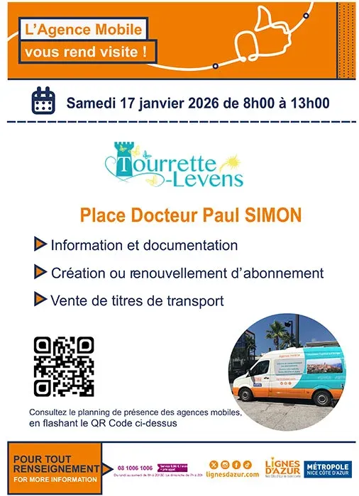 Ne manquez pas l'agence mobile Lignes d'Azur à Tourrette-Levens le 17 janvier 2026. Cet événement vous offre la possibilité de faire vos réservations directement sur place. Que ce soit pour des transports ou des activités, notre équipe est là pour vous guider. Profitez de cette opportunité pour découvrir des offres exclusives et simplifiez votre expérience de voyage grâce à notre service convivial.