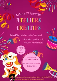 Venez découvrir des ateliers créatifs pour enfants à Breil-sur-Roya le 17 février 2026. Faites participer vos enfants à notre atelier dédié au Carnaval de 14h à 15h, suivi d’un autre sur le thème du Nouvel An chinois de 15h à 16h. Les ateliers sont ouverts aux enfants dès 4 ans, offrant une chance unique de stimuler leur créativité tout en s'amusant. Inscrivez-vous dès maintenant et laissez vos enfants s'épanouir dans un environnement ludique et éducatif.