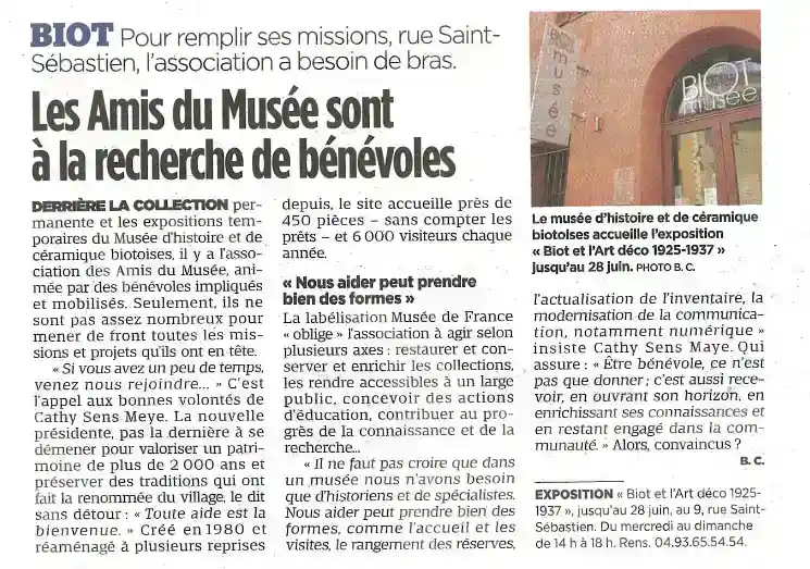 L'association 'Les Amis du Musée' à Biot recherche des bénévoles passionnés pour aider au développement de son patrimoine. Du 6 janvier au 28 juin 2026, engagez-vous dans des missions enrichissantes, comme l'inventaire et la mise à jour des collections. Rejoignez une équipe dynamisée par l'amour de l'histoire et de la culture locale au Musée d'Histoire et de Céramique Biotoises.
