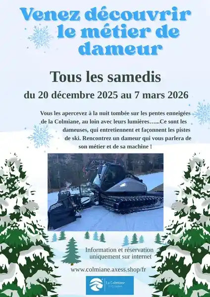 Du 20 décembre 2025 au 7 mars 2026, initiez-vous au métier de dameur à La Colmiane. Rencontrez les professionnels qui, à la tombée de la nuit, entretiennent et façonnent les pistes de ski. Cette expérience unique vous plongera au cœur de l'univers montagnard, mêlant passion et savoir-faire. Ne manquez pas cette occasion d’en apprendre davantage sur le travail indispensable qui garantit de belles journées de ski.