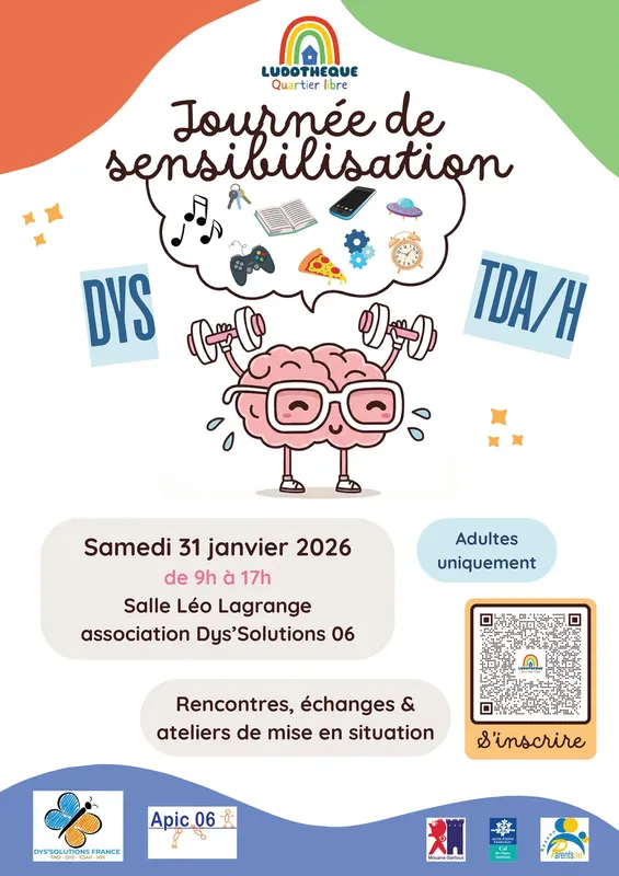 La Ludothèque Quartier Libre et l'association Dys'06 vous invitent à une journée informative dédiée aux troubles du neurodéveloppement, comprenant le TDAH et les troubles Dys. Cet événement se déroulera le 31 janvier 2026, de 9h à 17h, dans la salle Léo Lagrange à Mouans-Sartoux. Venez apprendre, échanger et sensibiliser sur ces sujets essentiels qui touchent de nombreuses familles. Ensemble, faisons avancer la compréhension et le soutien autour des troubles neurodéveloppementaux.