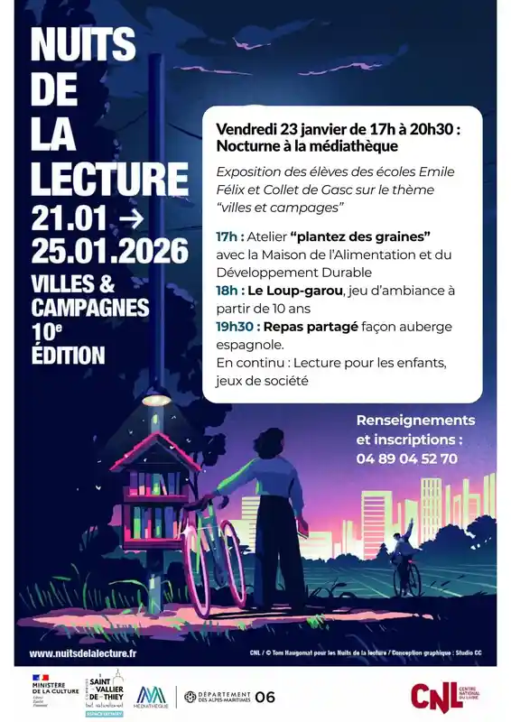 Participez aux nuits de la lecture à la médiathèque de saint-vallier-de-thiey le 23 janvier. Cette soirée immersive mettra en avant une exposition des élèves des écoles Emile Félix et Collet de Gasc, explorant le thème 'villes et campagnes'. À 17h, rejoignez l'atelier interactif 'plantez des graines' proposé par la Maison de l’Alimentation et du Développement Durable. Une occasion parfaite de célébrer la lecture et d'apprendre tout en s'amusant !