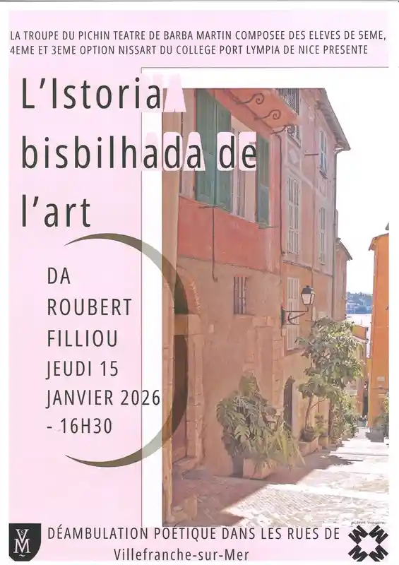 Le 15 janvier 2026, à partir de 16h30, la troupe du Pichin Teatre de Barba Martin, composée des élèves du collège Port Lympia, vous présente l'Istoria Bisbilhada de l'art à La Citadelle de Villefranche-sur-Mer. Cette déambulation poétique est l'occasion de découvrir l'expression artistique des jeunes talents. Un événement à ne pas manquer pour toute la famille, qui allie culture et divertissement dans un cadre historique.