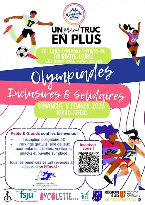 Venez vivre les Olympiades inclusives et solidaires à Tourrette-Levens le 8 février 2026. Organisées par l'association 'Un grand truc en plus' en collaboration avec l'association 'l'Envol', cet événement vise à promouvoir l'inclusion des adultes en situation de handicap mental. Joignez-vous à nous pour soutenir cette belle cause et participer à des activités sportives qui favorisent l'esprit d'équipe et la solidarité.
