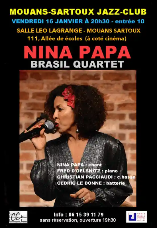 Venez vivre une soirée exceptionnelle avec le So a Papa Brasil Quartet le 16 janvier 2026 à la Salle Léo Lagrange de Mouans-Sartoux. La talentueuse compositrice brésilienne Nina Papa vous emmènera dans un voyage musical à travers le jazz et les sonorités latines. Entourée de musiciens de talent, préparez-vous à être enivré par une atmosphère rythmée et captivante. Ne ratez pas cette occasion unique de découvrir des performances vibrantes qui célébrent la richesse de la musique brésilienne.