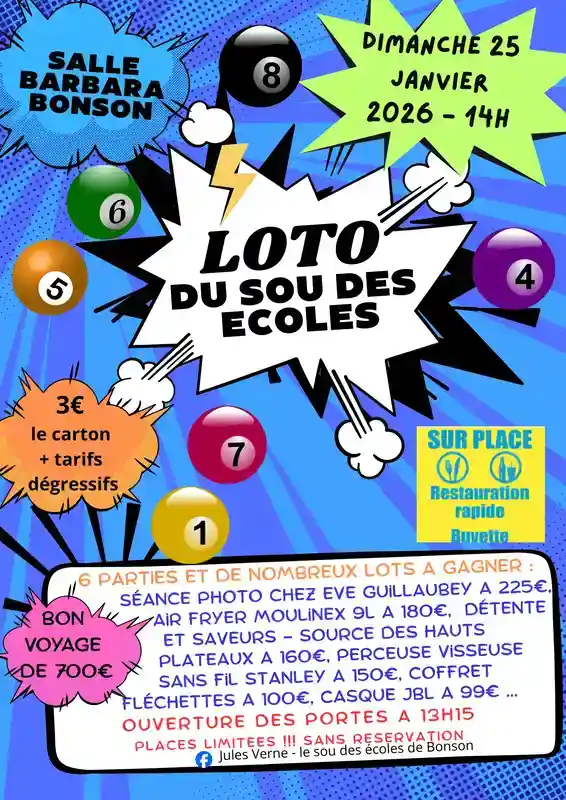 Venez tenter votre chance au loto du sou des écoles le 25 janvier 2026 à l'Espace Barbara à Bonson. À partir de 14h, procurez-vous des cartons à 3€ avec la possibilité de bénéficier de tarifs dégressifs. De nombreux lots vous attendent, incluant un air fryer Moulinex d'une valeur de 180€. Ne manquez pas cette occasion de passer un moment convivial en famille ou entre amis tout en soutenant les écoles locales.